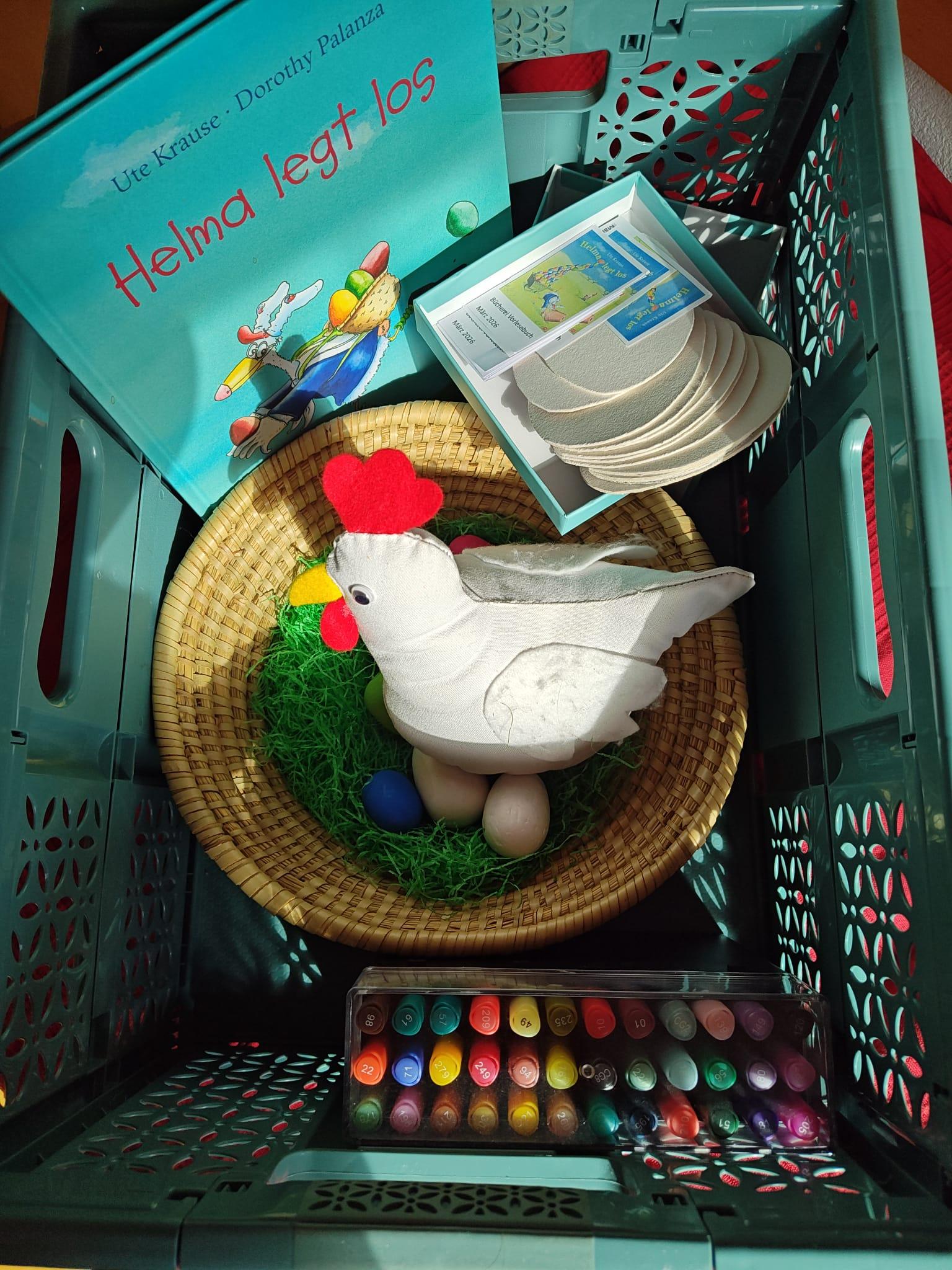 Heute hat Helga die Kinderkrippe besucht. Da Ostern ist, hat sie gern gesucht.... Wo ist das Nest? Wo sind die Bücher? Und wo ist nochmal das Vorlesebuch? Trotz Umbaus und noch etwas Chaos im Ausweichquartier (Container auf dem Parkplatz) bleiben wir dran und bieten unsere Services an - Leseförderung auch in schwierigen Zeiten! Danke, Helga!