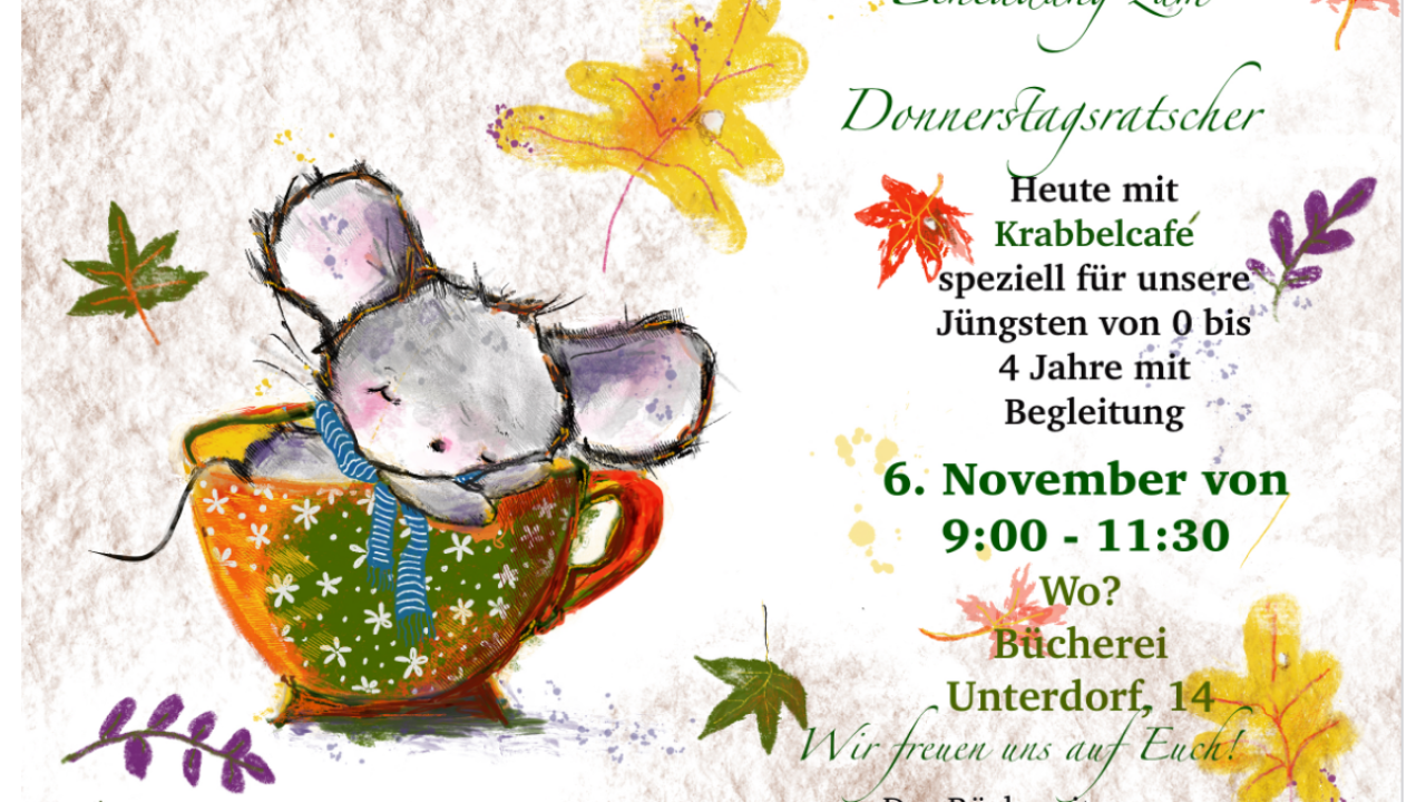Heute ist unser Büchereicafé speziell für die ganz Kleinen von 0 - 4 Jahren und ihren BegleiterInnen da, ob Mama, Papa, Oma, Opa, Onkel, Tante, Schwester..... Kommt mit euren Jüngsten und trefft andere Kinder und deren Angehörige.